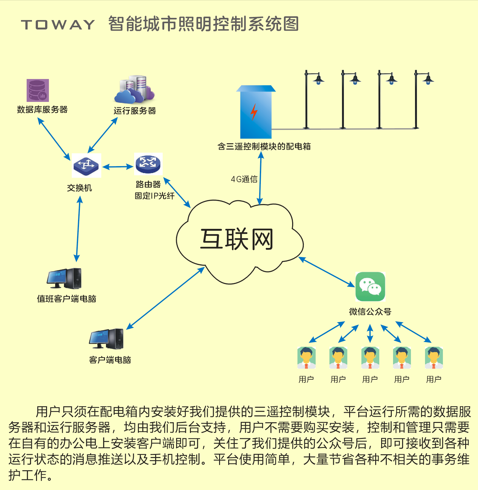 此方案對于一個縣城100臺路燈配電箱的體量,首年開支也只有三萬五千元,此后每年費用是兩萬五,本方案最大的優點就是費用低廉,這筆費用完全可以并入年度維護撥款中核銷。且不會有設備過保要重新采購的問題出現。
